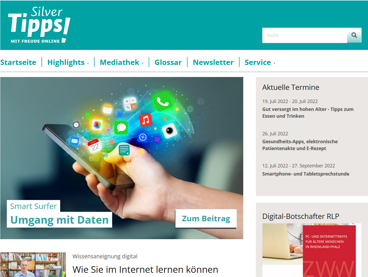 „Silver Tipps“ ist ein Serviceportal für ältere Onlinerinnen und Onliner rund um das Thema Digitalisierung. Informationen, Anregungen und Tipps, die den täglichen Umgang mit dem Internet, Smartphone und Co. sicher machen und Berührungsängste abbauen, werden fundiert und verständlich behandelt und dargestellt.